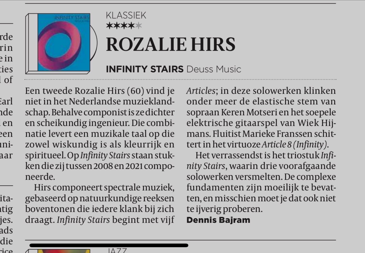 “The finely crafted music of composer and poet Rozalie Hirs is color, light, space, wind, movement, and something elusive. This wonderful portrait album features five solo pieces (for cello, voice, bass clarinet, electric guitar, and flute) as well as the trio Infinity Stairs, performed by outstanding musicians. Expansive, sophisticated, and contemplative chamber music that reveals great imagination.”