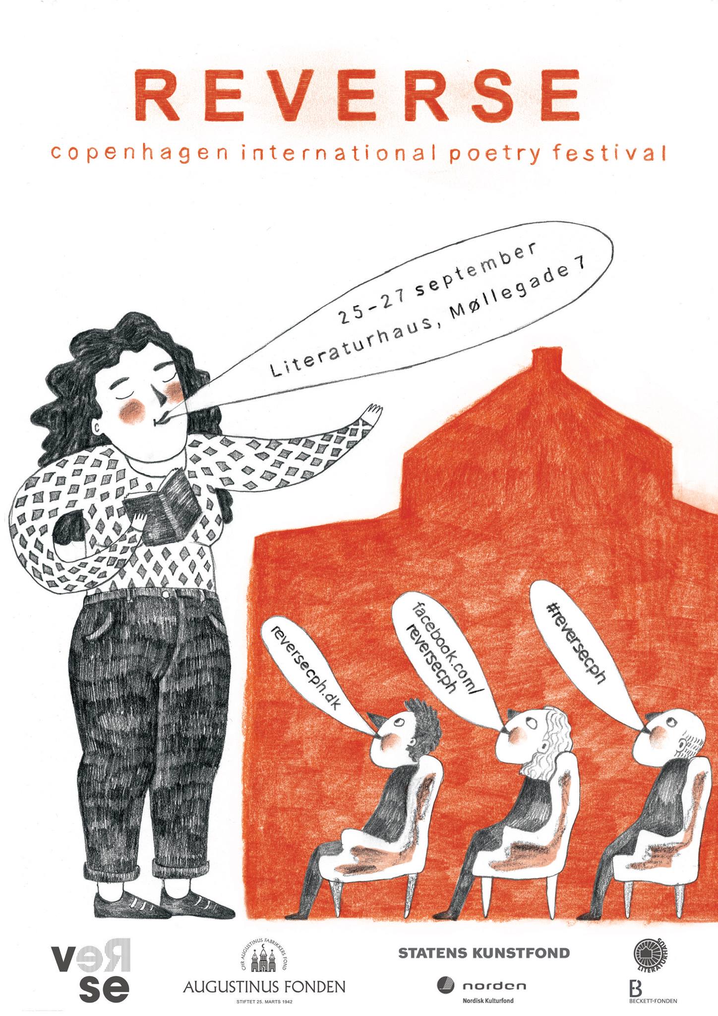 From 25 until 27 September 2015, Aleksandr Skidan (RUS), Eugene Ostashevsky (RUS) and Mónica de la Torre (MEX/US), Lars Skinnebach (DK), Ann Jäderund (SE), Elaine Feeney (IR), Mira Gonzalez (US), Uljana Wolf (DE), Cia Rinne (FIN), Yoko Tawada (DE/JAP), Caroline Bergvall (FR/NO), and Rozalie Hirs (NL) are among the poets of this year’s REVERSE International Poetry Festival, FKA Copenhagen International Poetry Festival. The festival takes place at Literaturhaus in Copenhagen, Denmark. For upcoming events you can stay in touch with REVERSE through Facebook.
